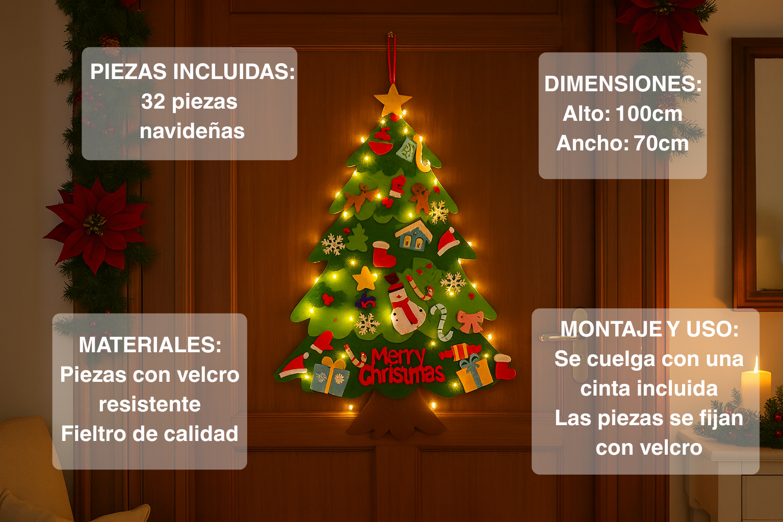El Árbol de Navidad de Fieltro KiddieLand™ está diseñado para que los más pequeños vivan la ilusión de la Navidad de forma divertida, segura y educativa.